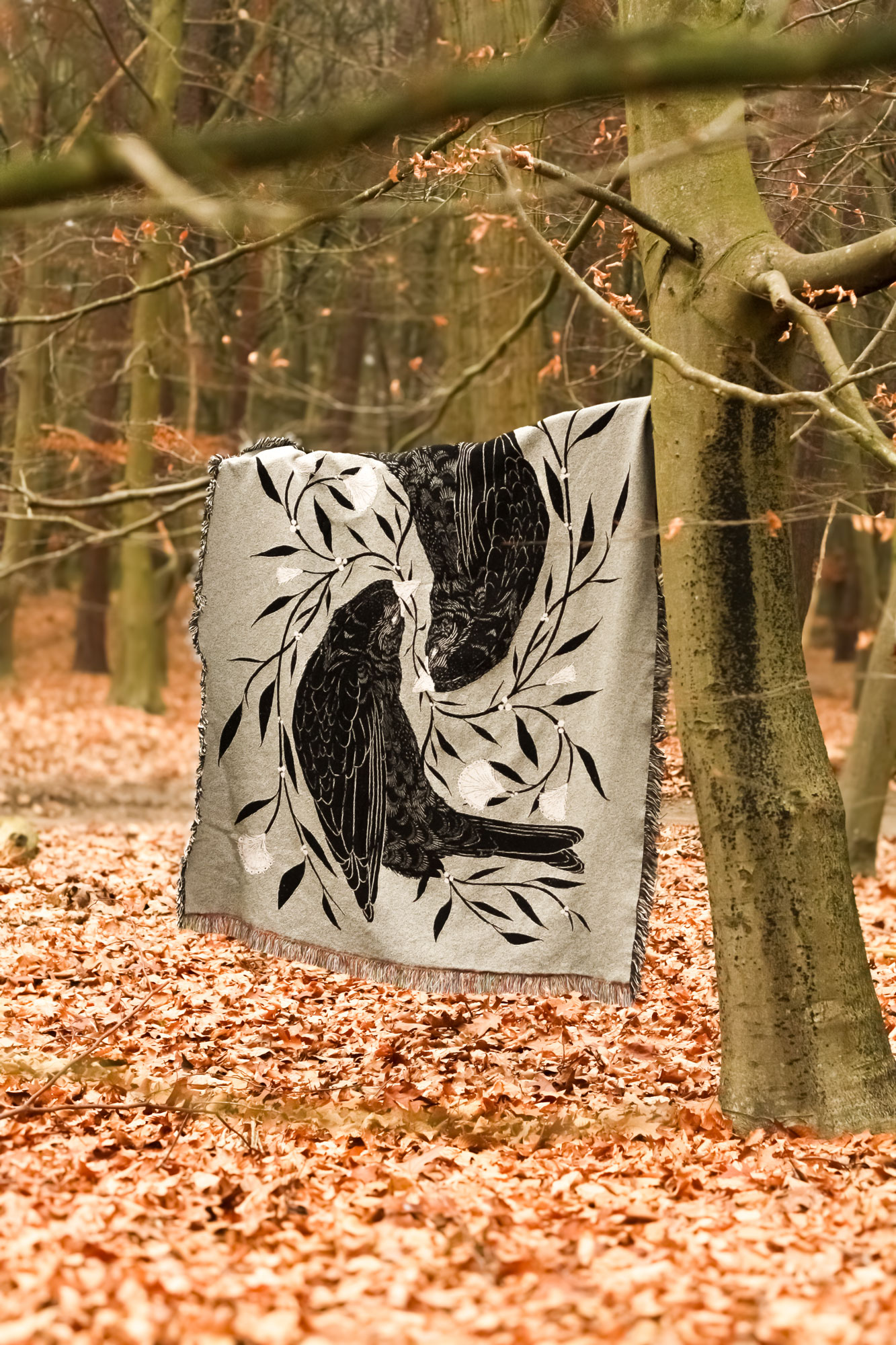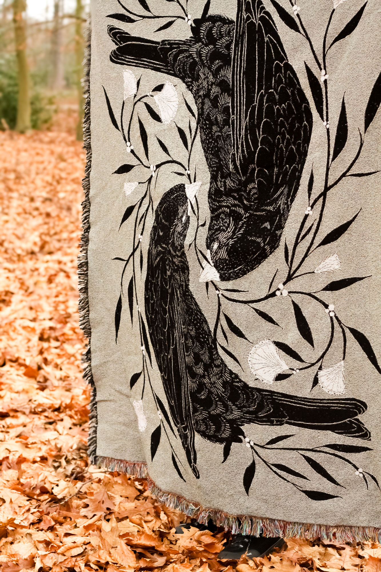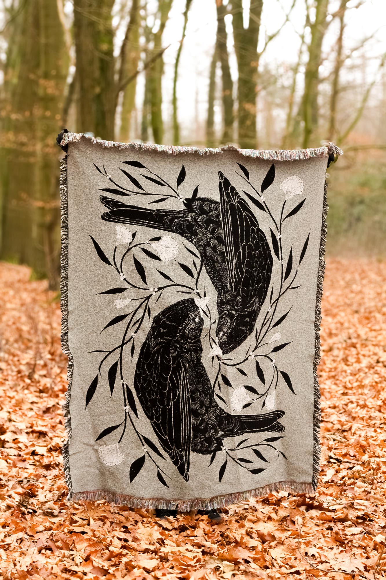 Deze tapestry/deken wordt in de Verenigde Staten gemaakt met een speciale weeftechniek die mijn ‘Flow’-illustratie vertaalt naar lagen van draad en textuur. Het resultaat is een zachte, rijke en gedetailleerde deken met een licht tactiele uitstraling, een heel andere ervaring dan een geprinte stof.