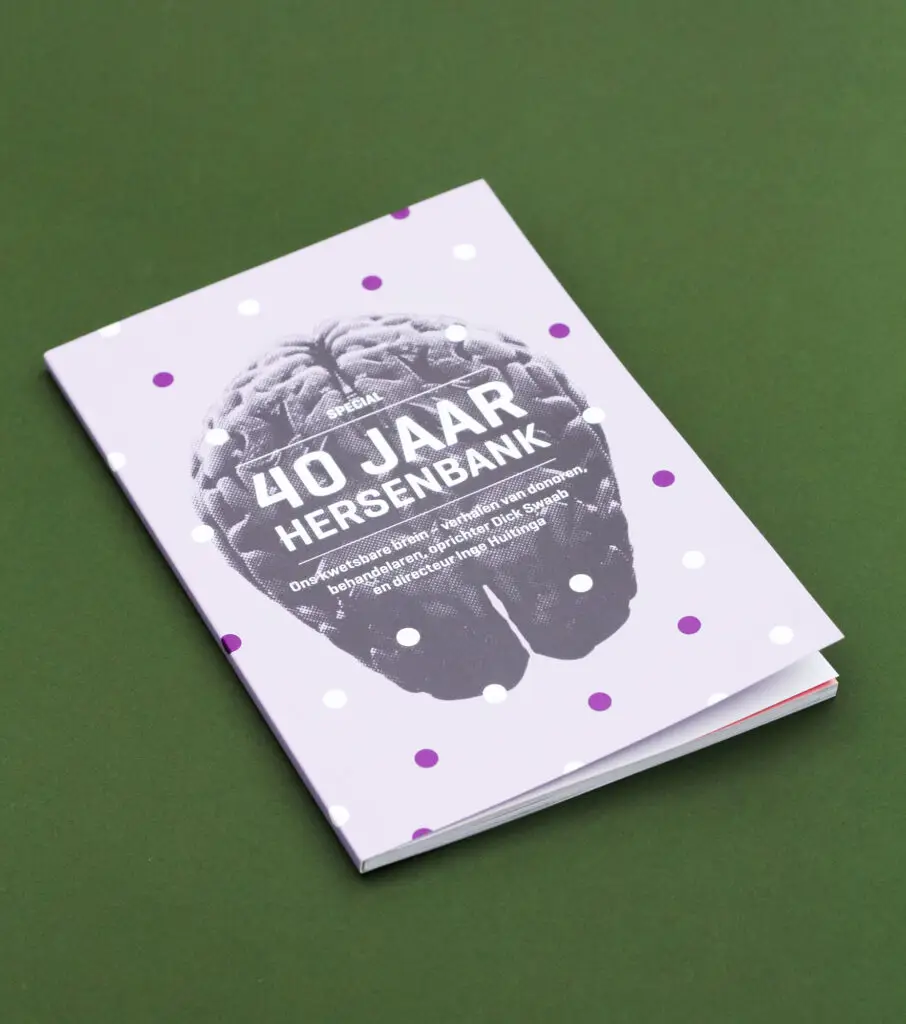 Dit zijn de projecten waar ik echt gelukkig van word. Voor het 40-jarig jubileum van de Nederlandse Hersenbank werd ik gevraagd een speciaal magazine te ontwerpen voor hun jubileumevenement.